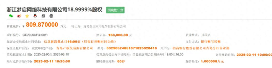 近日,浙江梦启网络科技有限公司(下称“浙江梦启网络”)18.9999%股权转让项目在青岛产权交易所公开挂牌。挂牌公告显示,该项目的转让方为青岛金王应用化学股份有限公司(下称“青岛金王”),转让底价为809.87万元。