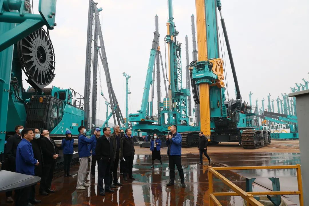 专家组一行在现场实地考察了四项科技成果的样机实物,由山河智能基础装备事业部总经理朱振新对样机进行了讲解,并介绍了超级旋挖、双轮铣、液压抓斗等全系列产品。