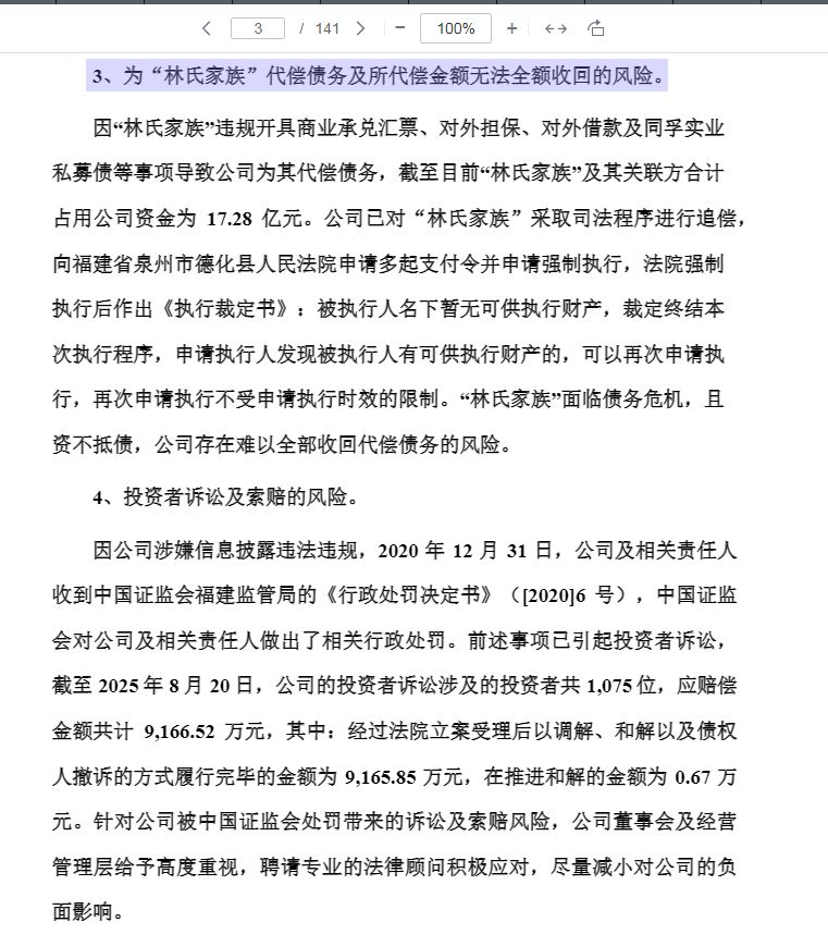 然而,原控股股东“林氏家族”留下的窟窿仍未填平。受林氏家族违规事项拖累,公司曾为其代偿债务,截至2025年上半年末,林氏家族及其关联方合计占用公司资金仍达17.28亿元。而“林氏家族”资不抵债,公司存在难以全部收回代偿债务的风险。