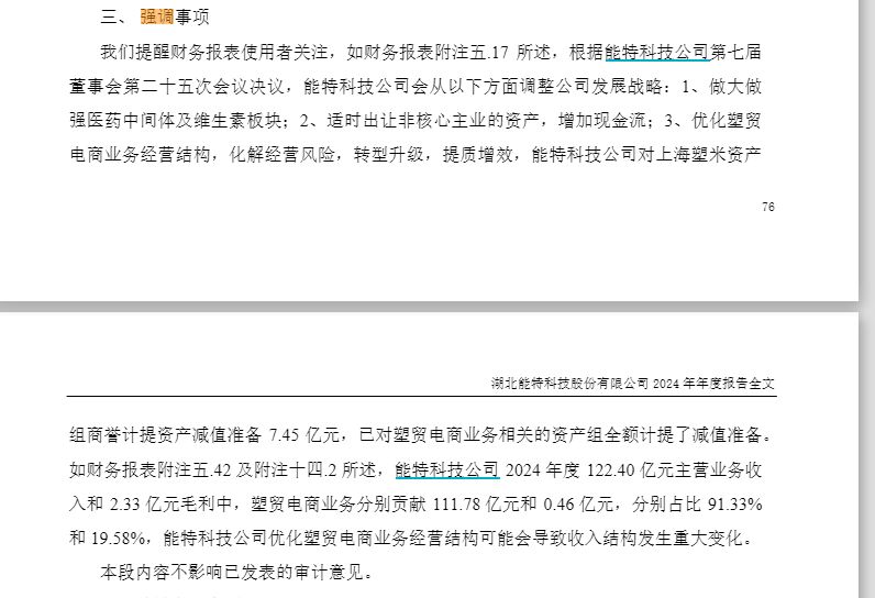 表面的盈利复苏难掩深层风险。《每日经济新闻》记者注意到,能特科技2024年财务报告被审计机构出具带强调事项段的无保留意见。审计报告“强调事项”直指两大关键:一是公司拟出让非核心主业资产,二是对塑贸电商业务相关资产组计提7.45亿元大额商誉减值。