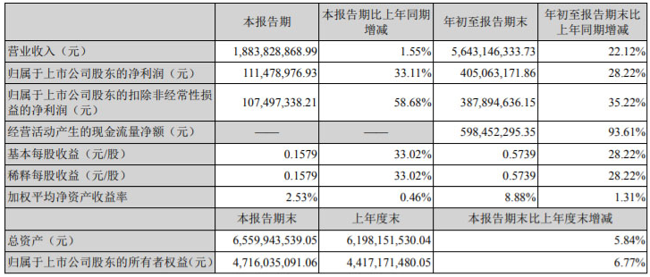 2021年前三季度,公司实现营业收入为564,314.63万元,同比增长22.12%;实现归属于上市公司股东的净利润为40,506.31万元,同比增长28.22%。
