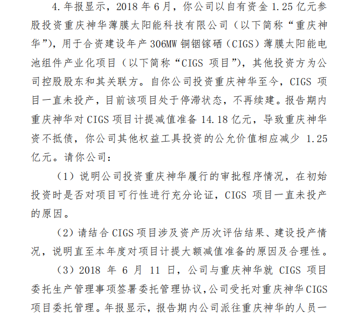 对此,深交所要求莱宝高科说明,公司投资重庆神华履行的审批程序情况,在初始投资时是否对项目可行性进行充分论证,CIGS项目一直未投产的原因。