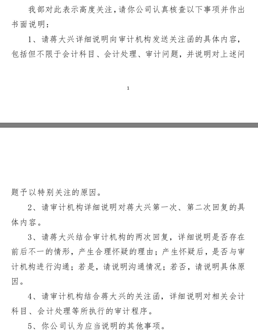 蒋大兴表示“在审计沟通过程中,早期审计机构对本人的关注函仅给予程序性回复,使本人对关注的相关财务数据产生合理怀疑。其后,在本人提议聘请新会计机构审阅财报以及将对拟续聘该审计机构的议案投反对票时,才给予具体回复。”