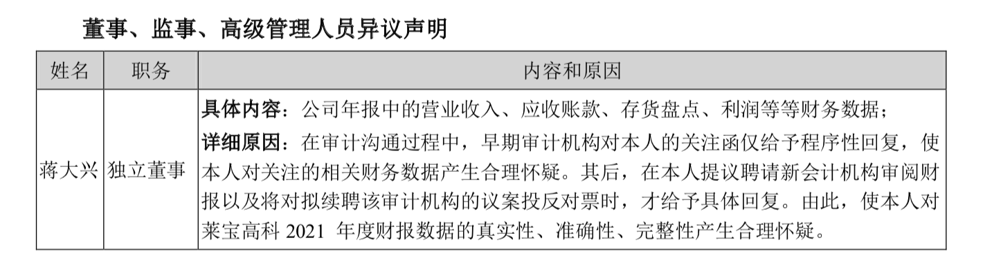 因此,该位独董对莱宝高科2021年度财报数据的真实性、准确性、完整性产生怀疑。