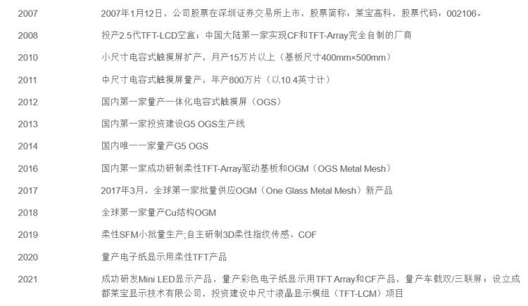 据公司官网介绍,2007年公司在深交所上市。2012年成为国内首家量产一体化电容式触摸屏的企业。