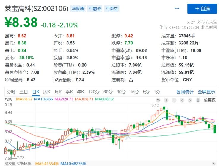 截至8月11日收盘,莱宝高科收跌2.10%,报8.38元/股,