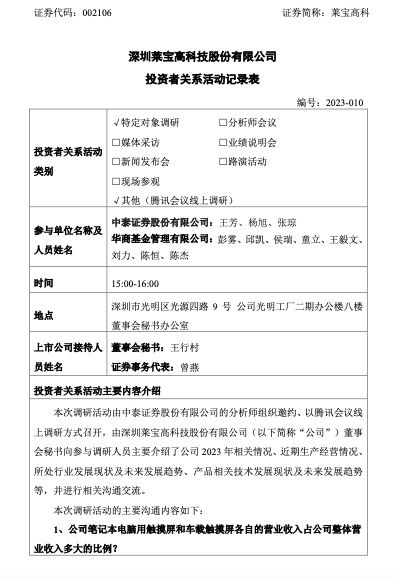 深圳莱宝高科技股份有限公司(以下简称“莱宝高科”或“公司”)10月26日晚间发布公告称,公司于10月16日接受了多家机构投资者的特定对象调研。在调研中,莱宝高科透露,2023年第三季度车载盖板玻璃和车载触摸屏的订单需求情况良好,尤其是双联屏车载盖板玻璃的订单需求增长较多;结合目前车载触摸屏业务板块的订单需求情况,今年下半年车载触摸屏业务板块的整体销售收入有望同比去年进一步增长。
