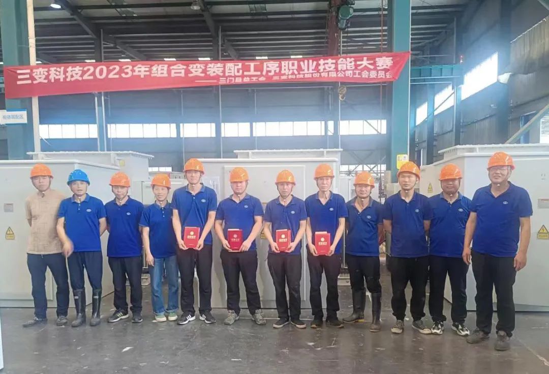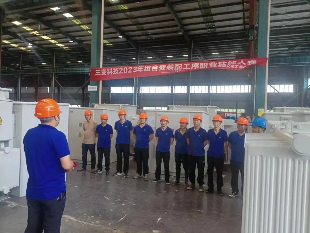 2023年6月9日,组合变车间装配现场高悬横幅,装配工们精神抖擞,摩拳擦掌,由县总工会牵头,公司工会组织的组合变装配工序职业技能大赛就在这里举行。公司工会副主席赖在旺、工艺员李国亮及质检员郑海鹏一起参与大赛的评比工作。