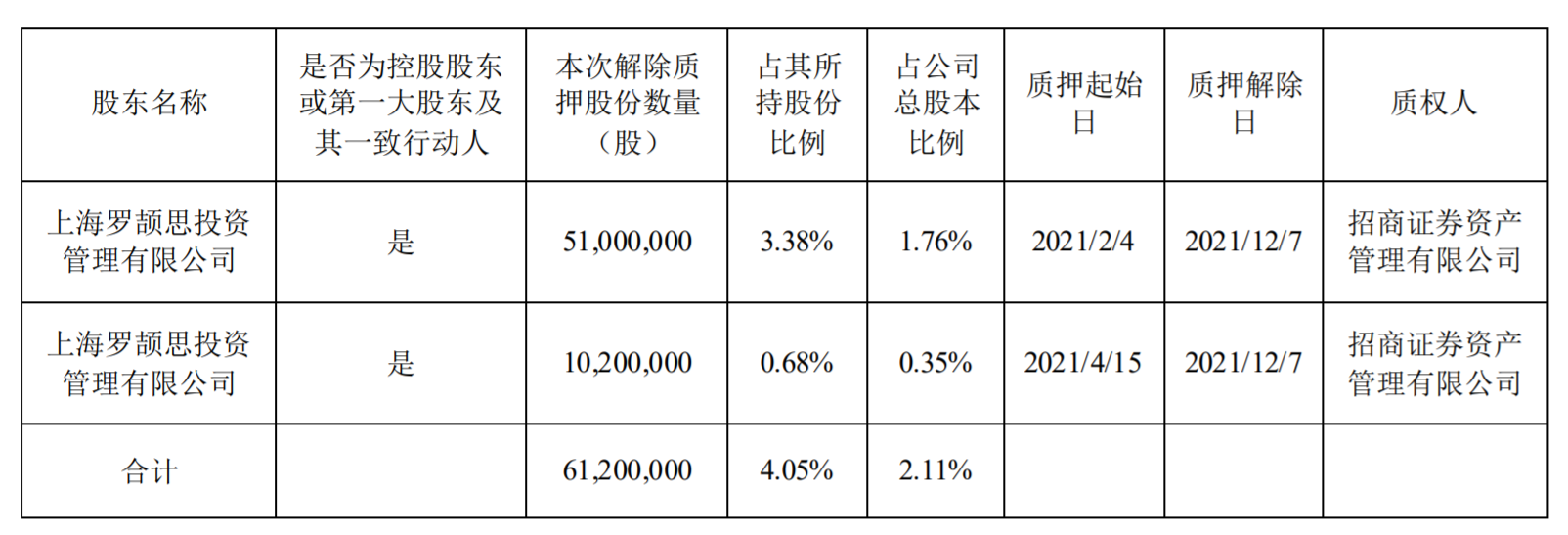 公告显示,韵达股份近日接到控股股东上海罗颉思投资管理有限公司(以下简称“上海罗颉思”)通知,获悉上海罗颉思将持有韵达股份的共计6120万股股份办理了解除质押手续,占韵达股份总股本比例为2.11%。