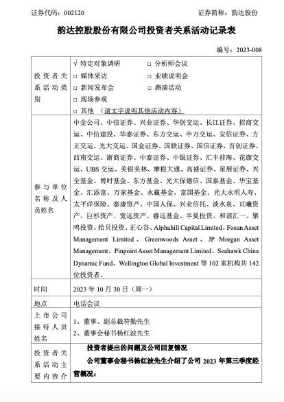 韵达股份向投资者介绍了公司2023年第三季度经营概况: