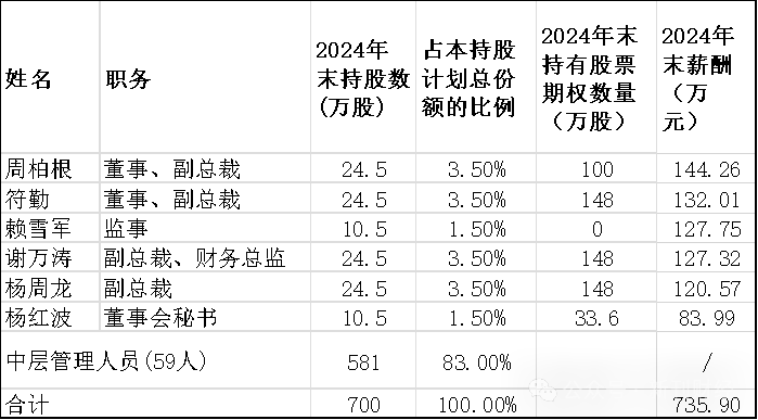 该持股计划初始参与者包括公司四位副总裁、一位监事、一位董事会秘书以及59名中层管理人员。最新公告披露,本次符合解锁条件的激励对象共计53人,较初始设立的65人有所减少。值得注意的是,虽然部分中层管理人员因离职丧失资格,但所有参与计划的高管目前均在任,且均按照持股计划足额认购。