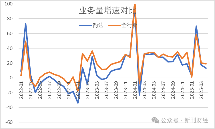 从业务量增速来看,韵达股份2025年1-4月呈现出明显的波动特征。虽然2月份增速跑赢行业,但4月份已落后于行业平均水平,1-4月累计业务量同比增长20.28%。若以2024年为基准,韵达的累计增速与行业整体水平基本持平,全年能否持续超越行业均值仍存在较大不确定性。