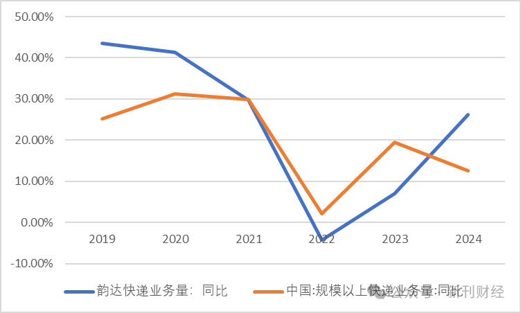 从业务量考核维度来看,2024年韵达快递业务量同比增长26.14%,确实超过21.5%的行业平均增速,满足了考核要求。但需要指出的是,2022-2023年韵达业务量增速分别为-4.31%和7.07%,均显著落后于行业平均水平。这种低基数效应使得2024年超越行业均值的考核目标较易达成,考核标准的实际约束力不强。