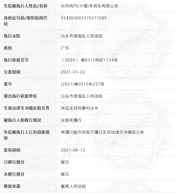 科陆电子在公告中表示,经检索信用中国网公示信息,东风特汽因有履行能力而拒不履行生效法律文书确定义务于2021年8月13日被汕头市澄海区人民法院纳入失信被执行人、社会法人严重失信黑名单中。由于东风特汽被纳入失信被执行人名单中,根据深圳市新能源汽车推广应用相关政策,相关新能源汽车已实际无法取得深圳市地方补贴。