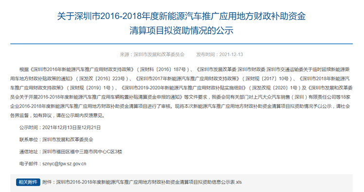 深圳市发展和改革委员会官网于2021年12月13日发布了《关于深圳市2016-2018年度新能源汽车推广应用地方财政补助资金清算项目拟资助情况的公示》。文件显示,东风特专在2020年度申报了1187辆新能源车的地方补贴,申报金额为5733.935万元;但这1187辆车全部被核减,清算金额为0元,核减原因是因生产企业即东风特汽为失信惩戒对象。