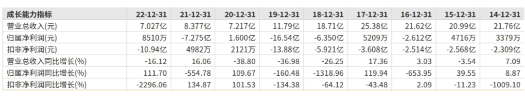 年报显示,2022年,天马股份实现营收7.03亿元,同比减少16.21%,净利润8510.46万元,同比增加111.7%,虽然净利润成功扭亏,但扣非净利润更为惨淡,亏损高达10.94亿元,同比减少2,296.06%。