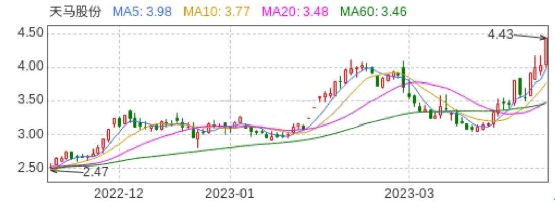 无惧重要股东减持套现、原实控人收警示函等利空消息,天马股份股价继续攀升,4月7日,天马股份涨停,截至收盘,股价涨9.93%,报收4.43元/股。