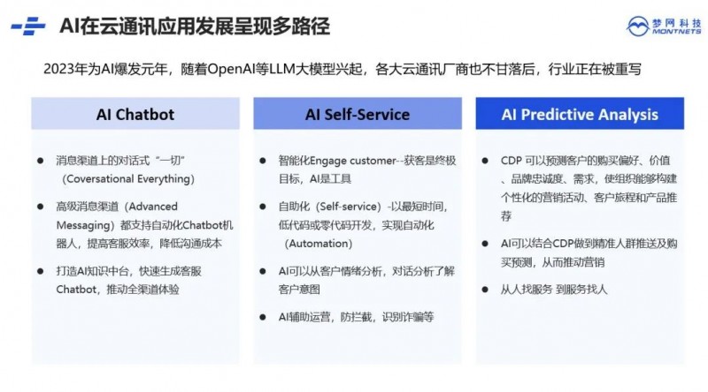 当下AI技术正以前所未有的速度重塑千行百业,云通信领域自然也不例外。随着AI技术的飞速发展,云通信行业正迎来深刻变革,已从从传统的通信模式向智能化、个性化、全渠道化的方向演进。随着OpenAI等LLM大模型兴起,各大云通讯厂商也不甘落后,AI在云通讯应用发展呈现多元路径,AI技术不仅提升了通信服务的效率和精准度,优化了用户体验,还推动了云通信从单一的通信功能向多元化的服务生态转变。
