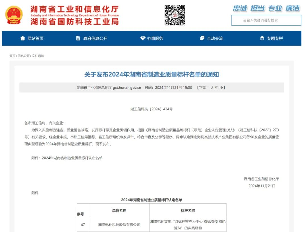 近日,湖南省工业和信息化厅与湖南省国防科技工业局官方网站正式公布了2024年湖南省制造业质量标杆名单,湘潭国资系统电化产投集团旗下湘潭电化科技股份有限公司上榜。