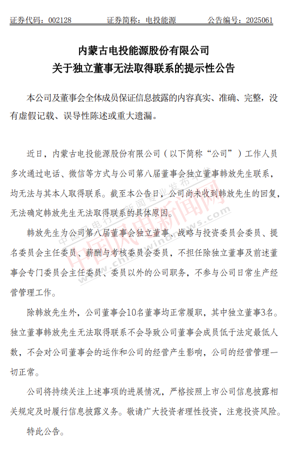 10月24日,国家电力投资集团旗下电投能源发布关于独立董事无法取得联系的提示性公告称,近日,公司工作人员多次通过电话、微信等方式与公司第八届董事会独立董事韩放联系,均无法与其本人取得联系。截至公告日,公司尚未收到韩放的回复,无法确定韩放无法取得联系的具体原因。