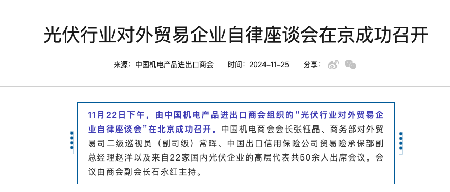 值得注意的是,行业内正不断发起“自律”“反内卷”倡议。继10月中旬的防止行业“内卷式”恶性竞争专题座谈会之后,11月22日,中国机电产品进出口商会组织召开了“光伏行业对外贸易企业自律座谈会”,包括TCL中环、隆基绿能、通威股份等在内的22家国内光伏企业参加了会议,会议规模和级别也进一步提升。