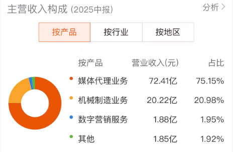 2025年上半年,利欧股份各项业务均出现下滑趋势。其中,媒体代理业务实现营收72.41亿元,同比下降10.64%;机械制造业务实现营收20.22亿元,同比下降0.81%;数字营销服务实现营收1.88亿元,同比下降33.44%。