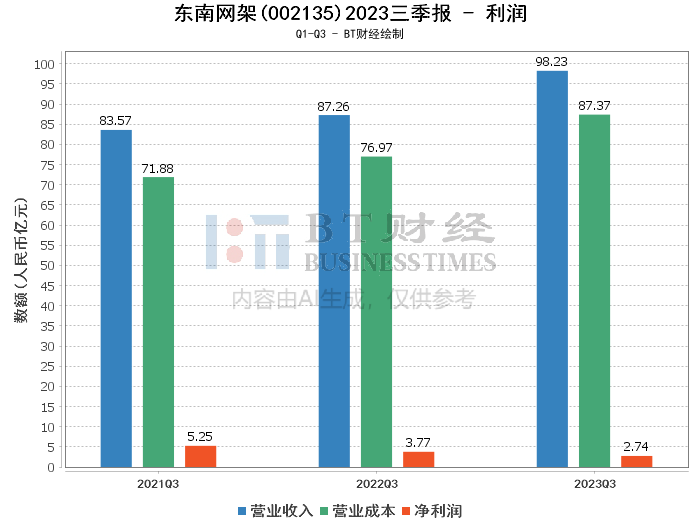 综上所述,东南网架在2023年三季度整体经营状况稳定,资产规模增长,营业收入增加,但利润和现金流量方面面临一定压力。这可能是由于市场竞争加剧、成本上升等因素影响。