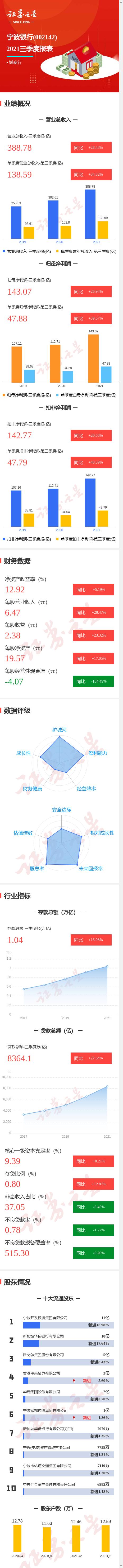 宁波银行2021三季报显示,公司主营收入388.78亿元,同比上升28.48%;归母净利润143.07亿元,同比上升26.94%;扣非净利润142.77亿元,同比上升26.66%;其中2021年第三季度,公司单季度主营收入138.59亿元,同比上升34.82%;单季度归母净利润47.88亿元,同比上升39.67%;单季度扣非净利润47.79亿元,同比上升40.39%;负债率93.03%,投资收益86.08亿元。