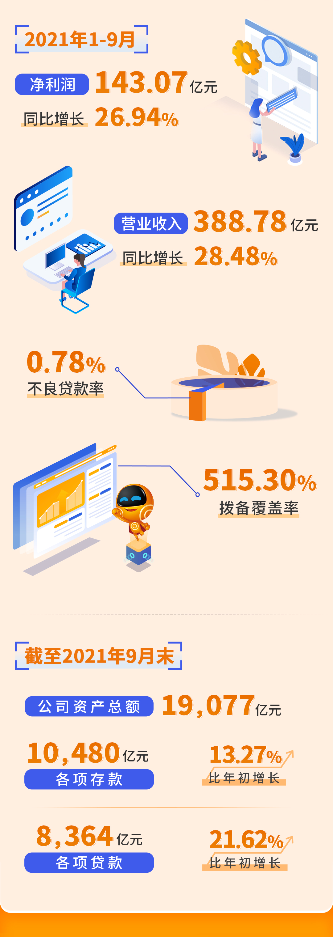 资产总额19076.76亿元,比年初增长17.27%;各项存款10479.80亿元,比年初增长 13.27%;各项贷款8364.11亿元,比年初增长21.62%。
