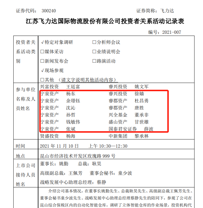 具体来看,飞力达披露的《投资者关系活动记录表》显示,11月10日,与董承非同时出现的还有多位知名投资人。宁泉资产创始人杨东带着余璟钰、沈沁、钱敏伟、张斌等人也前往现场调研了飞力达,睿郡资产创始人杜昌勇和同事唐胜亦参与其中。