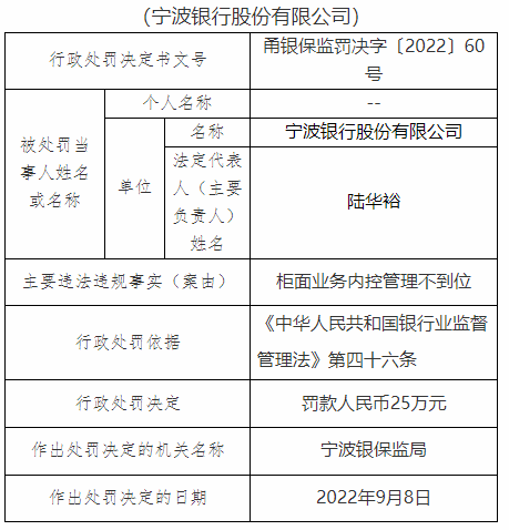 宁波银行被罚25万元 因柜面业务内控管理不到位