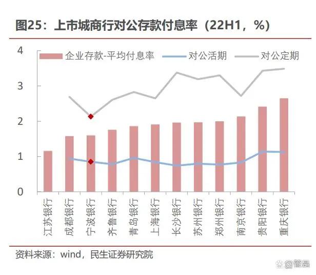 客户基础扎实+粘性高+注重结算存款归集,宁波银行对公活期负债优势显著。宁波银行紧抓账户流和资金流,对于低成本结算存款留存有重要作用。尽管 2018 年以来,宁波银行对公活期存款在存款总额中的占比有所回落,但仍保持在 30%以上的较高水平,截至 22H1 在上市城商行中排名第四。