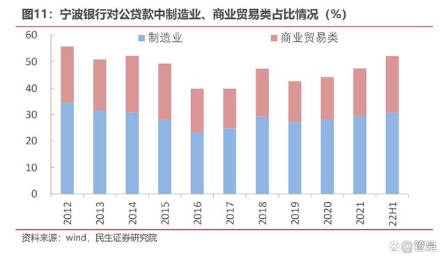 这种现象的出现,我们认为是宁波银行的客户结构所致。在上市前,宁波银行明确提出对公业务核心客户群是相对成熟或成长较快的中小型企业,尤其是拥有自营进出口权的制造型企业。从行业分布看,出口企业主要列入制造业或商业贸易类。早在 2006 年,宁波银行投向这两大行业的贷款占对公贷款比重高达 72.8%,截至 22H1,仍占据半壁江山。业绩层面反映有所滞后,可能是外需变化反映到企业生产行为、再反映到融资需求中间的时滞。