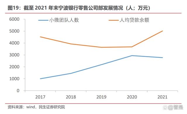 基础客户拓展基础上,发力核心客户建设,对存款规模增长起到重要作用。 2021 年,宁波银行成立一级部门机构业务部(针对对公客户),致力于服务客户个性化、数字化、综合化的金融服务。成立以来,落地国资监管、专项债、预售房资金监管等一批项目,并形成有效资金沉淀,2022 年上半年机构存款净增 292 亿元,贡献对公存款增长的近 20%。组织架构上,依托零售公司部专营小微,从“人海战术”走向效用提升。2007 年,宁波银行对公业务重塑组织架构,分设大中企业和小企业业务两条管理条线, 2008 年小企业业务从公司业务中独立出来,成立零售公司部,专营小微业务发展,成为国内较早专营小微业务的银行之一。零售公司部小微团队人数从 2017 年的 1000 人快速提升至 2020 年的近 3000 人,2021 年团队人数小幅下降不足 6%,但人均贷款余额大幅攀升 36%。