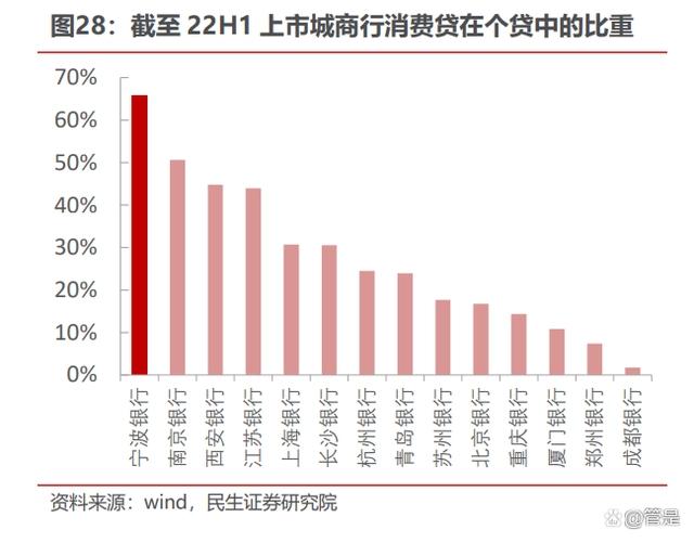 以消费贷为主的个贷结构,带来领先的个贷收益率。较早切入消费贷市场,助力宁波银行收获优质客户以及较高市场份额,也形成了以消费贷为主的个贷结构。尽管 2020 年以来宁波银行按揭贷款投放有所提速,但截至 22H1,消费贷在个贷中的比重仍将近 2/3,显著高于可比同业,消费贷相对更高的利率水平也使得宁波银行个贷收益率在上市城商行中排名首位。