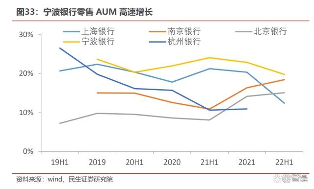 1、零售 AUM 增速快、结构好。截至 22H1,宁波银行零售 AUM 达到 7300 亿元,较 2018 年底实现翻番,2019-2021 年复合增速高达 23%,在可比同业中持续处于领先水平。