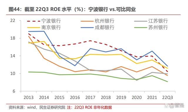 ROE 长期在同业中处于领先水平,背后是优异业绩的支撑。回溯过往 10 年,宁波银行 ROE 在上市城商行中持续维持在前三位,且表现出更好的稳定性,截至 22Q3,年化 ROE 水平达到 14.6%。长期领先的 ROE 来自强业绩支撑,2013- 2021 年宁波银行营收、归母净利润复合增速领先上市城商行平均水平 5pct、7pct。我们认为,未来宁波银行业绩仍有望强势增长,高 ROE 有望延续,主要来自四维度支撑。