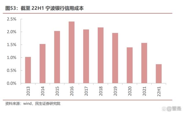资产质量长期优异的背后是成熟的风险文化。首先,在董事长陆华裕的带领下,宁波银行坚持“控制风险就是减少成本”的风险理念;第二,宁波银行历任行长多有风险管理条线工作经验;第三,在风险管理体系上,宁波银行坚持在统一的授信政策、独立的授信审批基础上,持续完善行业研究、产业链研究,进而更好地应对经济周期和产业结构调整。展望未来,宁波银行资产质量有望延续优异。一是经营单位均位于经济发达区域,在信用分化时期,资产质量仍有良好保障;二是 2019 年以来在自身前瞻性布局以及监管引导下,持续加大不良核销力度, 2022 年上半年核销规模已超 2021 年全年,与此同时不良净生成率却延续下降,这就意味着未来不良率有望继续下探;三是宁波银行对公房地产贷款占比较低,受此轮房地产市场调整影响相对较小。