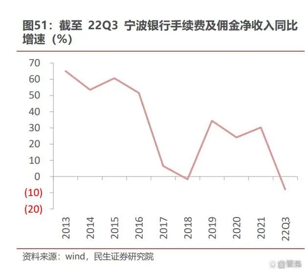 低基数效应下,2023 年中收迎来较好修复的确定性强。拆分宁波银行中收结构看,与资本市场、财富业务相关度高的代理及托管业务收入占比稳定在 80%以上。受 22Q1 及 22Q3 权益资产价格跌幅较深的影响,宁波银行代理及托管费收入表现不佳,截至 22Q3,中收同比增速已降为负,22Q4 尽管权益市场有一定起色,但是固收市场又出现较大波动,带来了理财赎回等债市负反馈,因此我们预计宁波银行 2022 年全年中收增速相对疲软,对于 2023 年形成低基数。
