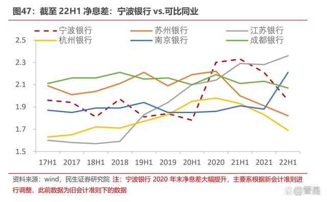 票据贴现大幅增长,或是“战略性”储备。一般来说,票据贴现出现“异常性”多增,通常是有效信贷需求不足,银行信贷冲量的结果。但从 2022 年区域金融机构贷款同比增速看,宁波表现亮眼,优于南京和杭州,在这样的背景下,22H1 宁波银行票据贴现力度显著高于可比同业,可以理解成一种战略性的信贷额度储备,特别是在 2023 年经济复苏背景下,这些战略性储备有望转化为期限更长、收益更高的信贷品种,进而带来可观的净息差弹性。