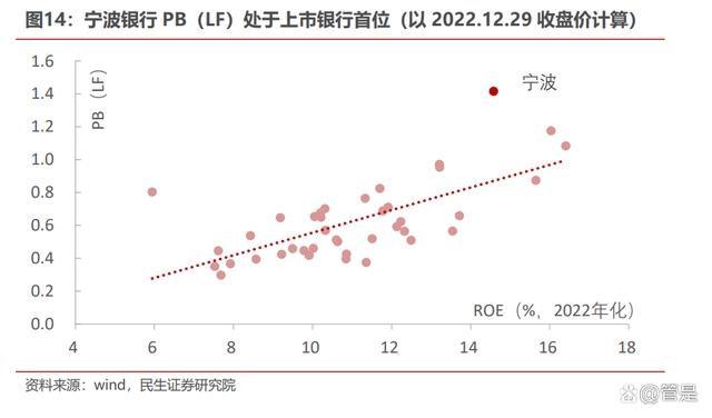 宁波银行估值水平处于行业首位。根据 2022 年 12 月 29 日收盘价计算,宁波银行 PB(LF)为 1.4 倍,在 A 股上市银行中位居第 1。尽管 ROE 不及招行、成都及宁波银行,但是 PB 溢价效应明显。