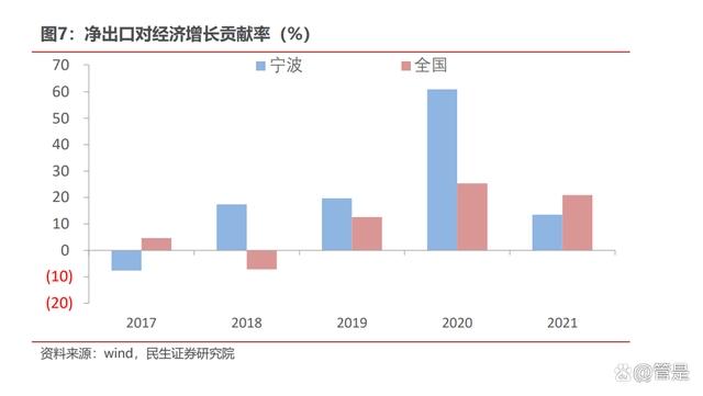 宁波市舟山港是全球第一大港口,奠定外向型经济发展基础。《2021 年全球港口发展报告》显示,宁波舟山港以 12.2 亿吨货物吞吐量居全球前 50 大港口之首,连续 13 年居世界第一。港口是外向型经济发展的基础,截至 22Q3,宁波海关进出口总额在全国中的比重达到 6.3%,较 20Q1 提升 1.1pct,净出口对于宁波经济增长的贡献率波动相对较大,在 2020 年曾高达 61%。