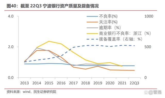 资产质量长期优异,历经检验。回顾过去十年,宁波银行不良贷款率持续保持平稳向好,即使是 2012 年后浙江省出现较为严重的担保链、资金链风险后,宁波银行不良率指标波动显著弱于浙江省金融机构整体水平,期间不良前瞻性指标关注率、逾期率虽有所上行,但改善情况领先于全省。