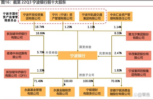 栉风沐雨 25 载,造就城商行标杆。宁波银行成立于 1997 年,2006 年 5 月引入战略投资者——新加坡华侨银行,之后 14 个月内公司完成“引战—跨区—上市”三步走,2007 年成功上市,为国内首家在 A 股挂牌上市的城商行。截至 22Q3,宁波银行总资产 2.3 万亿元,排名 A 股上市城商行 4/16。