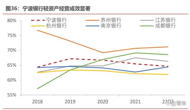 3、助力轻型银行战略转型。财富管理业务是银行轻资产经营的重要抓手,我们用“风险加权资产(RWA)/总资产”表示轻资本经营成效,可以看到 2019 年年以来宁波银行该指标持续下降,一定程度表明财富管理战略的确对于轻型银行转型起到重要推动作用。