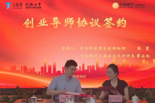宁波银行上海古北支行行长翟云红与同济科技园总经理助理张震共同签订创业导师协议。根据协议,上海分行将为园区企业成长提供多元化的增值服务,通过不同主题的培训、讲座、辅导等助力创业企业成长。
