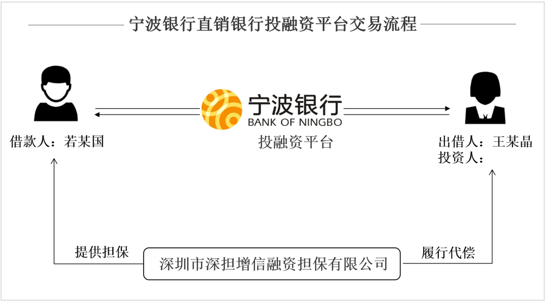 在整个融资贷款过程中,融资人/借款人通过宁波银行直销银行投融资平台与出借人/投资人完成“融资贷款”交易,宁波银行引入深圳市深担增信融资担保有限公司为出借人/投资人提供担保服务,这与P2P平台引入担保机构为出借人/投资人提供担保完全一致。