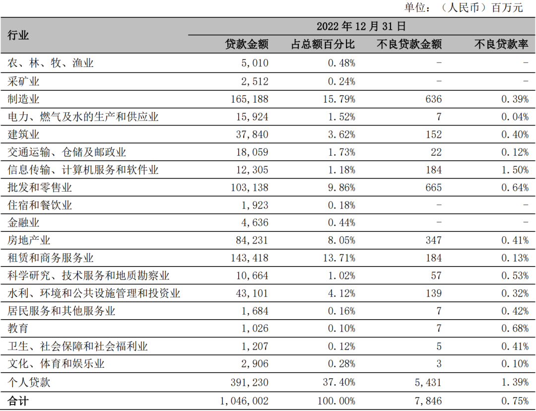 宁波银行2022年年度报告披露,截至报告期末,该行企业贷款和垫款余额5653.83亿元,占总贷款的54.05%。其中,企业贷款和垫款余额6547.72亿元,占贷款总额的62.6%。企业贷款占比最高的四个行业分别为制造业1651.88亿元、租赁和商务服务业1434.18亿元、批发和零售业1031.38亿元、房地产业842.31亿元。