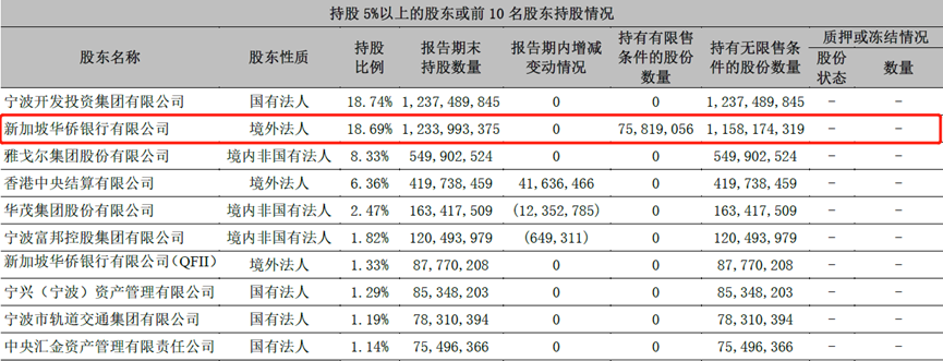 据招股书,截至2022年12月31日,华侨银行是宁波银行的第二大股东,持有无限售条件的股份数量为1,158,174,319股,持股数量为1,233,993,375股,持股比例18.69%。股东性质为境外法人。