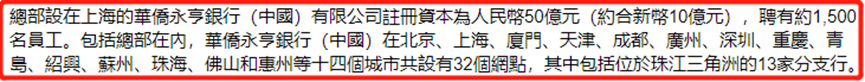 据华侨银行官网、永亨银行官网,永亨银行总部位于上海,包括总部在内,永亨银行在北京、上海、厦门、天津、成都、广州、深圳、重庆、青岛、绍兴、苏州、珠海、佛山和惠州十四个城市共设有32个网点。注册资本逾50亿元人民币,提供全套个人金融产品和服务,包括人民币和外币储蓄账户和定期存款、外汇服务、结构性产品等投资产品、QDII(合格境内机构投资者)、医疗和意外保障、本地单位信托、网上银行服务、借记卡、ATM服务和个人贷款产品。